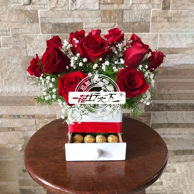 描述: 12朵红玫瑰、8颗费列罗巧克力、礼盒装。